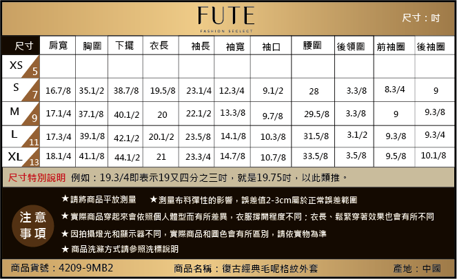 商品表布:聚酯纖維60% 羊毛38% 其他纖維2% 裡布:聚酯纖維100%